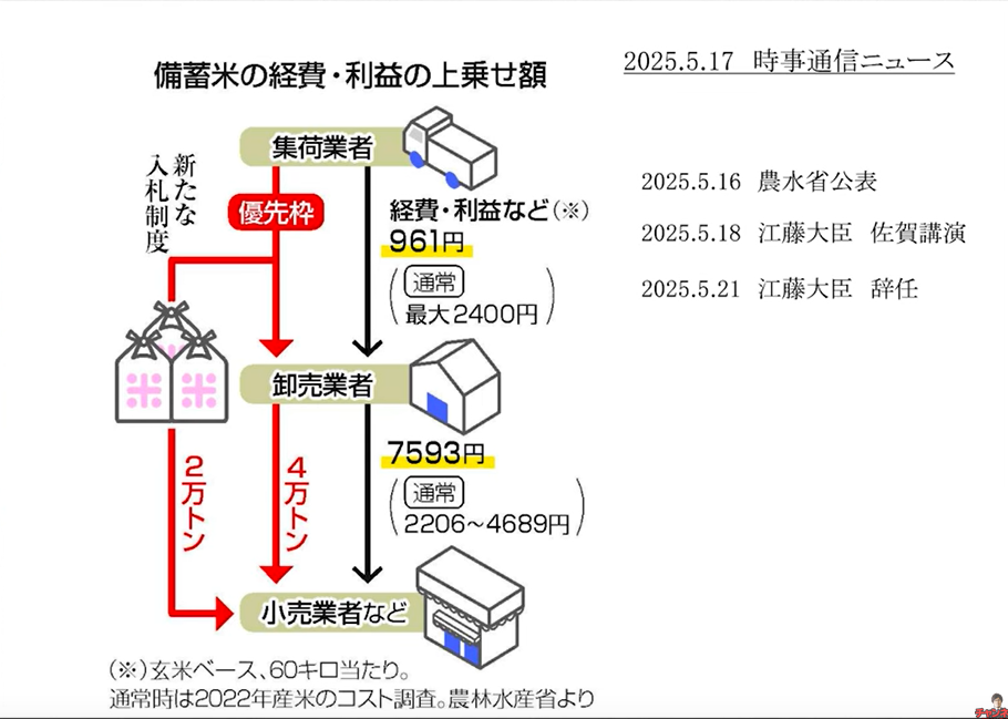 - 自然なコメの価格を破壊し、備蓄米の放出に合わせて、卸売業者が隠し持っていた2024年産米が市場へ放出され、さらに2025年9月・10月の2025年産の新米の供給と、ミニマムアクセス米〔義務的に輸入するコメ〕とが重複し、コメの供給過剰が既定路線になっている。